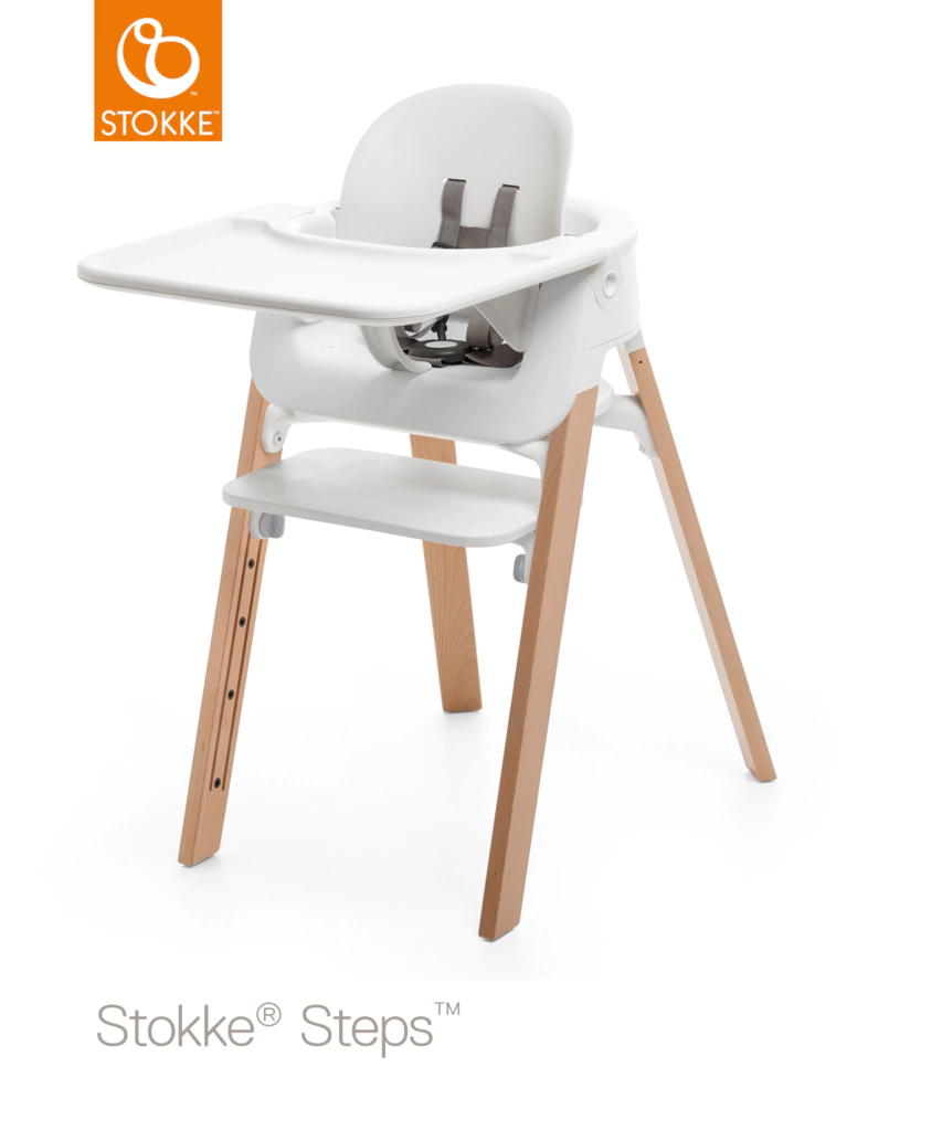Los accesorios opcionales transforman la silla Stokke Steps en un asiento que puede utilizarse con la hamaca desde que tu hijo nace para acercar tu bebé recién nacido a la mesa, y con el Stokke® Steps™ Baby Set para crear una silla de bebe