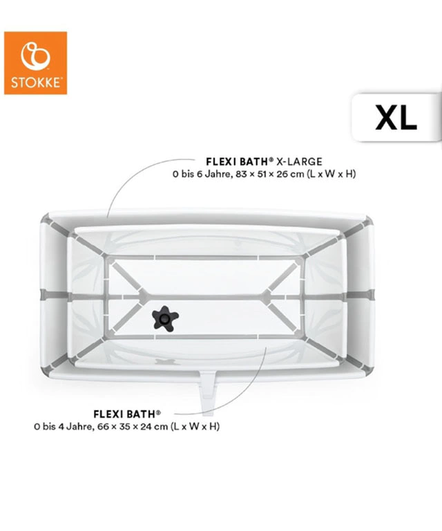 Amplia y espaciosa, la bañera Stokke® Flexi Bath® Extragrande es apta para bebés en crecimiento y niños pequeños hasta aproximadamente los 6 años, tiene todas las magníficas características de nuestra versión original, solo que cuenta con más amplitud.